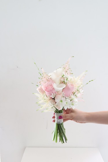 연핑크 장미와 화이트 카라를 믹스한 여성스러운 느낌의 부케입니다.